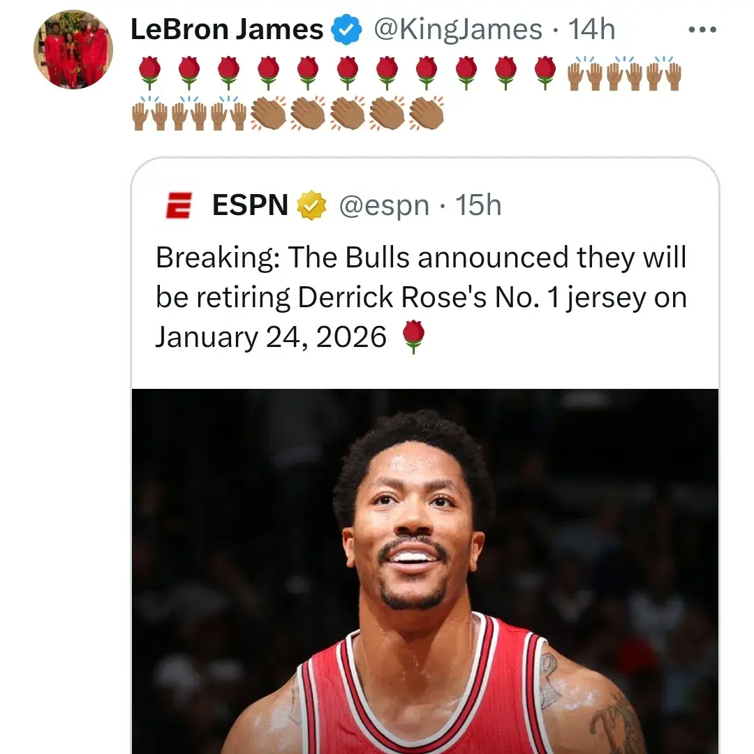 对于德里克罗斯而言,这一刻很梦幻,因为他也想不到,公牛会有一天主动退役自己的球衣号码。对于这个好消息,曾经的对手、好兄弟以及队友勒布朗詹姆斯,也是第一时间在个人社交媒体X平台上,发图文致敬这位曾经的东部强敌。一个充满了玫瑰,拍手和举手表情符号的致敬图文。